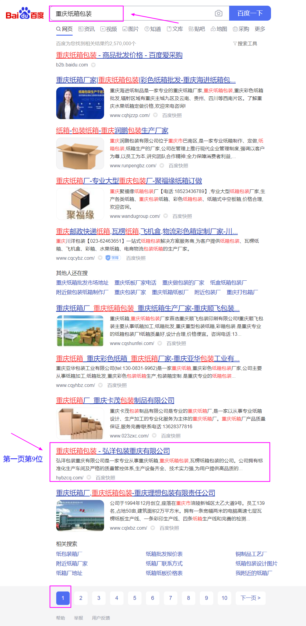 “重慶紙箱包裝”優(yōu)化排名推廣,新站上線不到兩周,排名到百度首頁