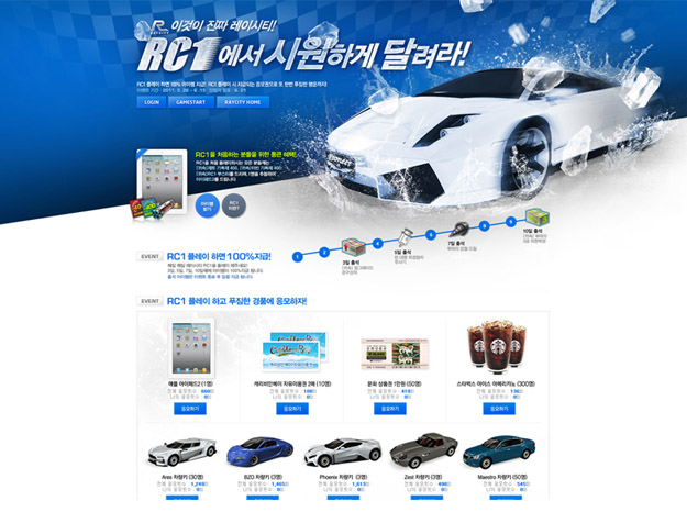 上圖,將背景旋轉(zhuǎn)后,大面積的斜面產(chǎn)生了很強(qiáng)的速度感,賽車急速飛馳著,好像下一秒就要從電腦中沖出來一樣,傾斜的大標(biāo)題和旋轉(zhuǎn)后的背景交叉配合,使畫面整個都運(yùn)動起來。這種方法可以應(yīng)用到很多運(yùn)動的主題上。