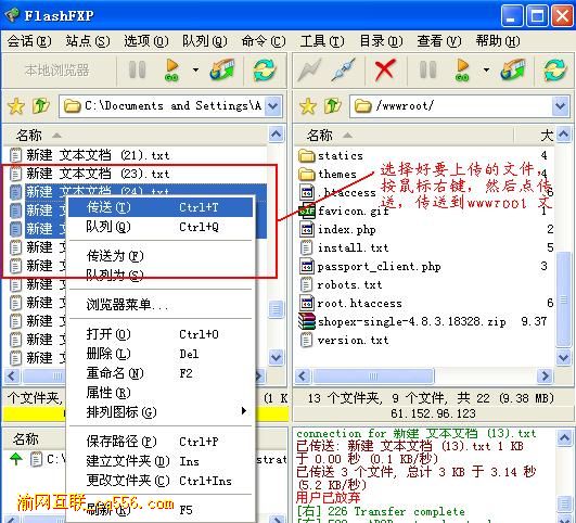 4.選擇您要上傳的文件,并點(diǎn)鼠標(biāo)“右鏈”->“傳送”,將文件傳到到WWWROOT目錄里. 這時在隊列欄里會顯示正在上傳及未上傳的文件, 當(dāng)您的文件上傳成功完成后,在命令欄里會出現(xiàn)“傳送完成”的提示,此時在過程目錄欄里就可以看到您上傳的文件了。