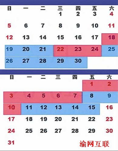 注:紅色部分為假日,藍色部分為工作日