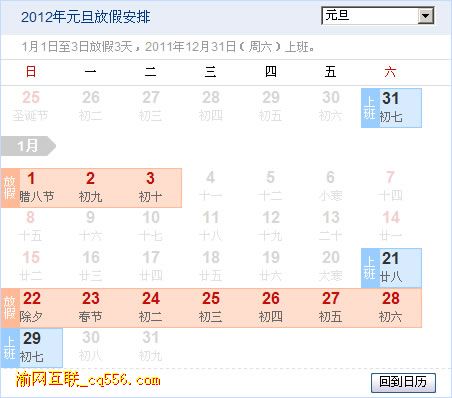 1.元旦:2012年1月1(星期日)日至1月3日(星期二),放假3天。2011年12月31日(星期六)上班。