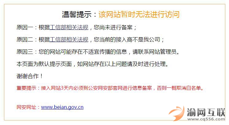 望各位網(wǎng)站管理人員,提前作好備案,免得因為這樣的事情,導(dǎo)致網(wǎng)站各法正常訪問而影響重慶公司業(yè)務(wù)的發(fā)展。