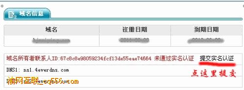 商中的提交流程:通過我們站進(jìn)入域名管理后,域名信息頁面就可以看到(圖1),未通過實名認(rèn)證,提交實名認(rèn)證>點擊>提交實名認(rèn)證>進(jìn)入提交自己的個人或企業(yè)信息。