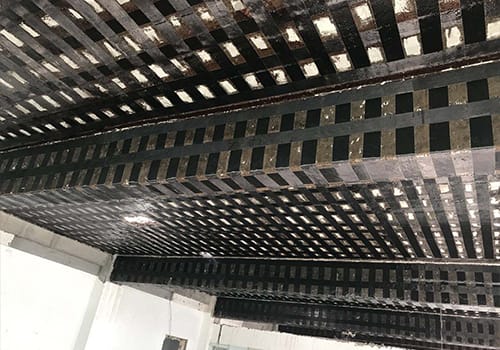 2、材料預(yù)備:按設(shè)計尺寸剪裁碳纖維布,且嚴(yán)禁折疊;若碳纖維布原有折痕,應(yīng)裁往有折痕一段。按要求對碳纖維膠粘劑入行配比,用電動攪拌器均勻攪拌。3、粘貼碳纖維布:將配制好的碳纖維膠粘劑均勻涂抹于粘貼部位的混凝土表面,將裁剪好的碳纖維布按照放線位置敷在涂好的碳纖維膠粘劑的混凝土表面,碳纖維布應(yīng)充分鋪平,不得有褶皺,用特制滾筒沿碳纖維布方向多次滾壓,使膠液充分浸漬碳纖維布。(粘貼多層碳纖維布時,請在碳纖維布表面的膠液達(dá)到指干狀態(tài)時立即粘貼下一層;若延誤時間超過1h,請等12h后方可重復(fù)上述步驟入行粘貼,但粘貼前應(yīng)重新將碳纖維布粘合面上的灰擦拭干凈)最后一層碳纖維布粘貼完畢,應(yīng)在其表面均勻涂刷一道碳纖維膠黏劑。若碳纖維布需要搭接,其受力方向每端搭接布不應(yīng)小于200mm。??